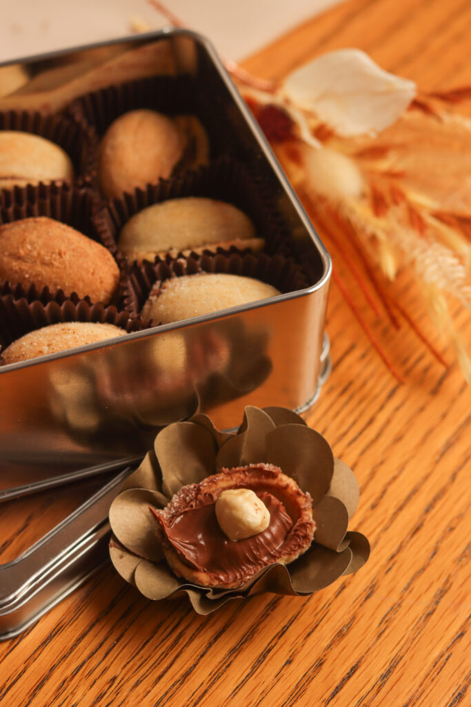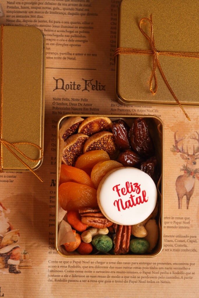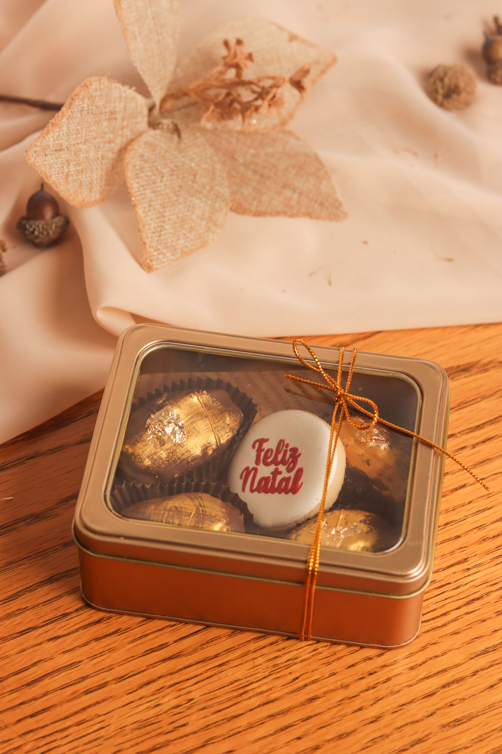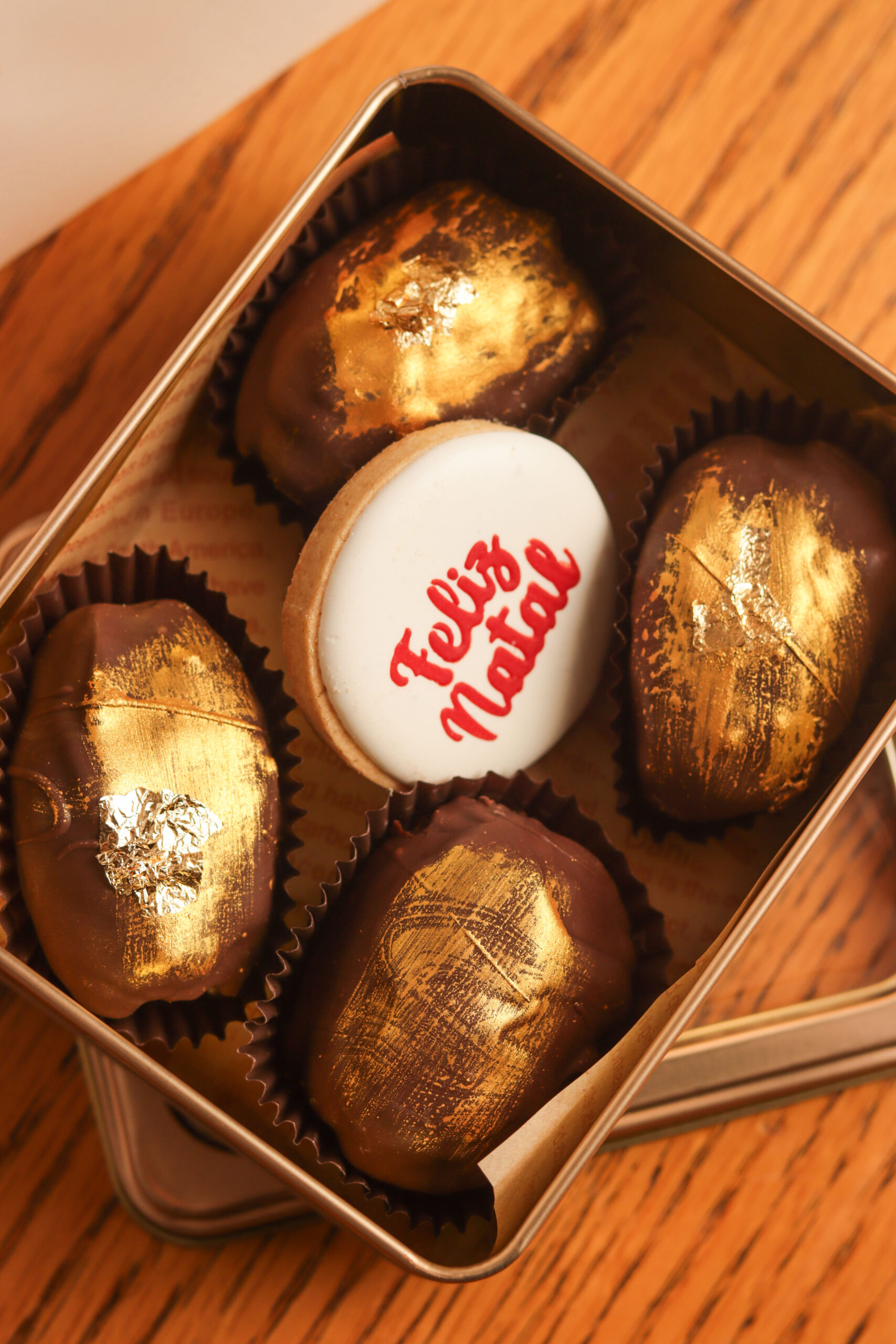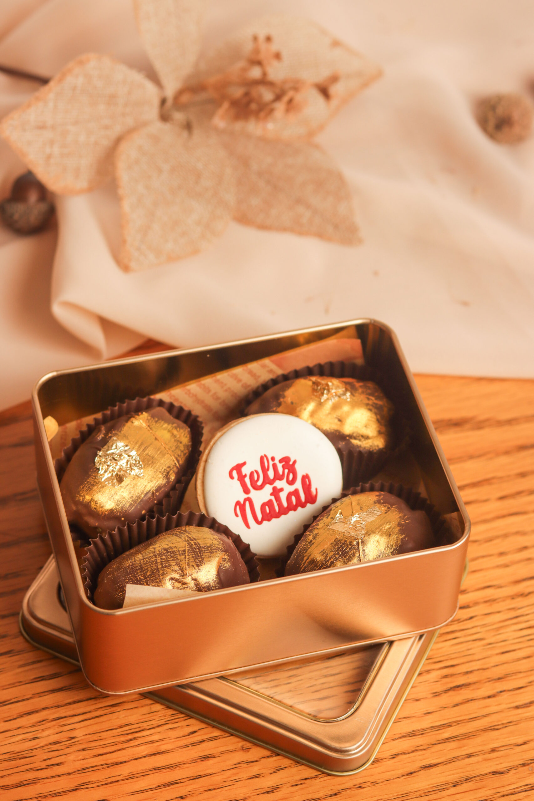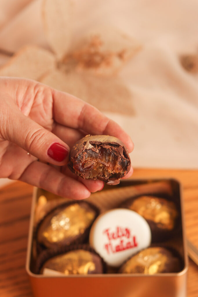 Tâmaras recheadas com creme de damasco e envoltas emchocolate meio amargo. Cada tâmara recebe delicados toques de folha de ouro.