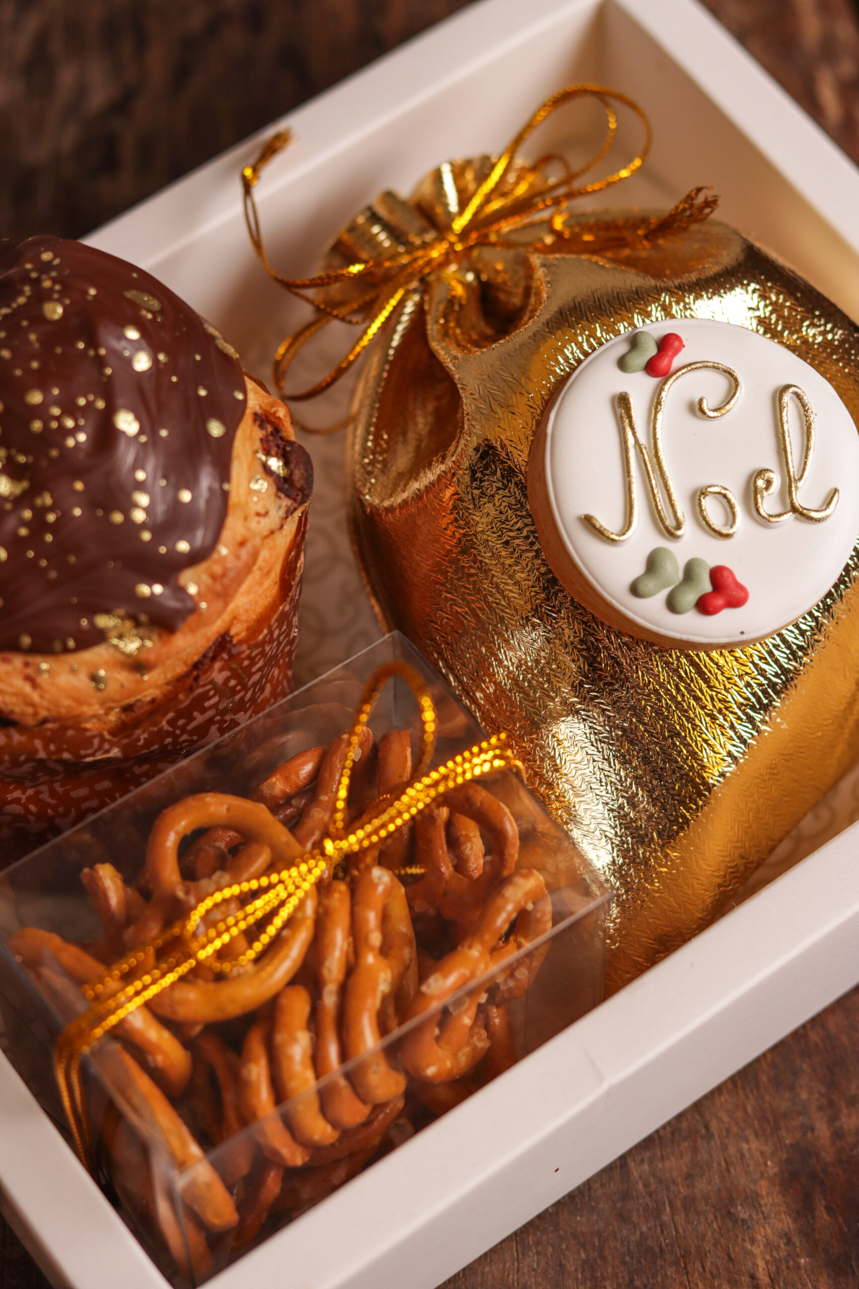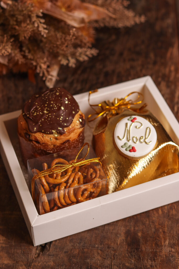 Panetone decorado com chocolate meio amargo e leve toque dourado